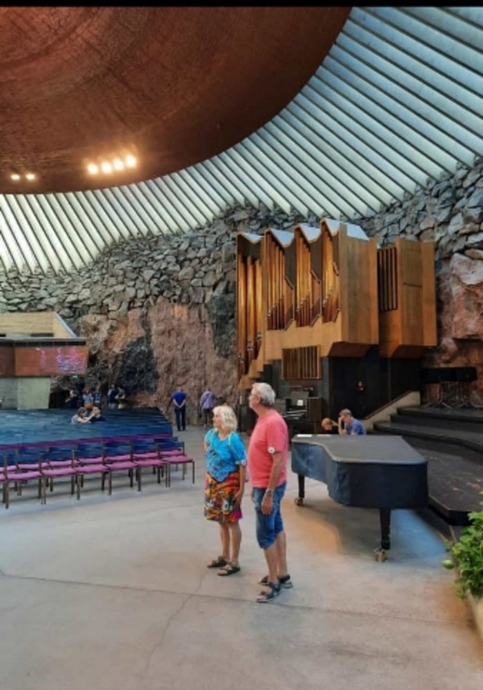 Aber es geht ja weiter, jetzt tauchen wir in die Schärenwelt ein. 5 Fähren bringen uns bis Mossala. 2 Tage später verlassen wir den Schärengarten und fahren nach Helsinki, der Hafen liegt mitten in der Stadt. Mit einem Guide besichtigen wir am nächsten Tag u.a. die einzigartige Felsenkirche, das Sibelius Denkmal und natürlich die alte Markthalle. Am Hafen gibt es ein Riesenrad, eine braune Gondel soll eine Sauna enthalten, eine schwarze soll mit einem Bett ausgestattet sein und der Champagner soll bereitstehen.