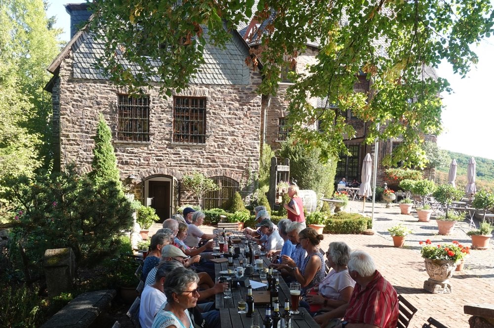 Nächste Station war Alf, wo wir am Nachmittag eine Wanderung zur Burg Arras unternahmen und vom Burgherrn persönlich durch die Burg geführt wurden. Die Aussicht vom Burgturm war beeindruckend! Tags darauf radelten wir über Kloster Stuben nach Senheim und auf der anderen Moselseite nach Bremm. Dort bestaunten wir den Calmont, den steilsten Weinberg Europas.